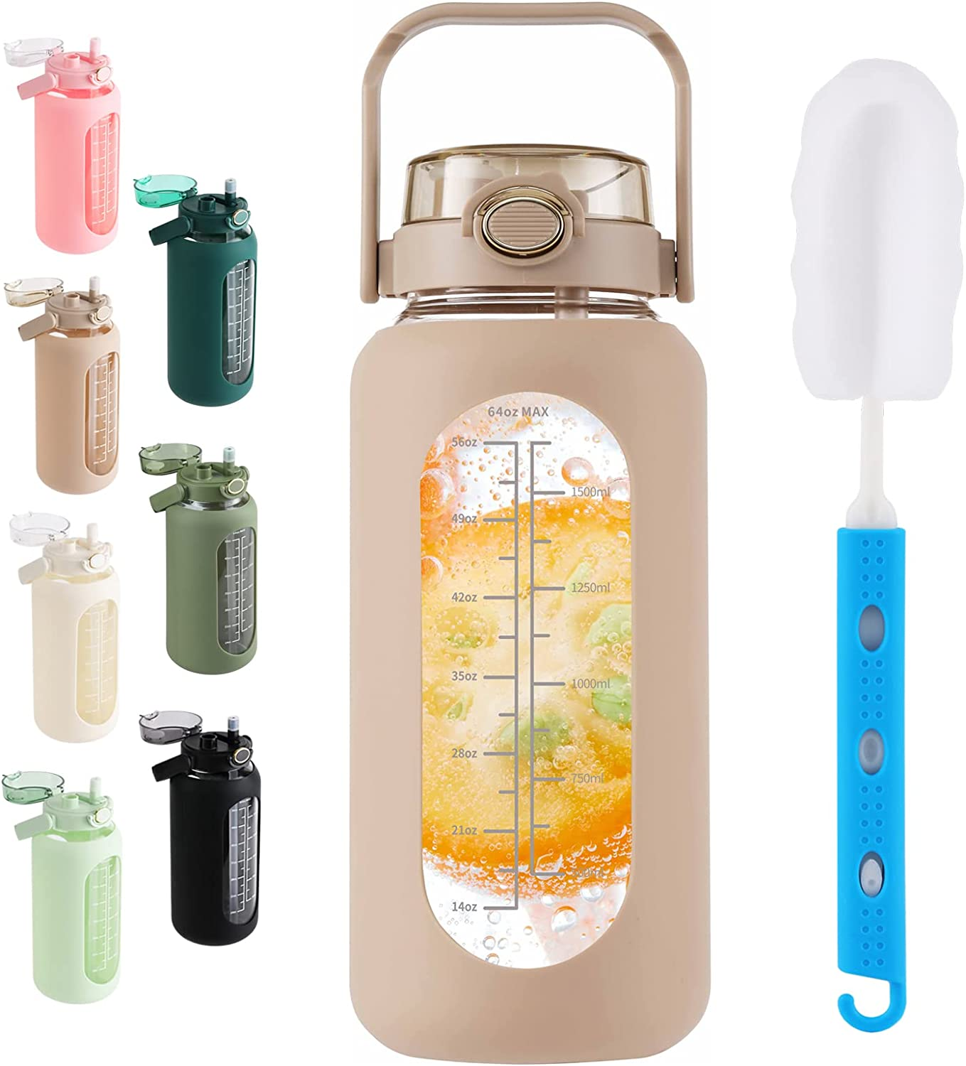 64Oz Glass Water Bottle with Straw and Handle Lid Half Gallon Motivational Glass