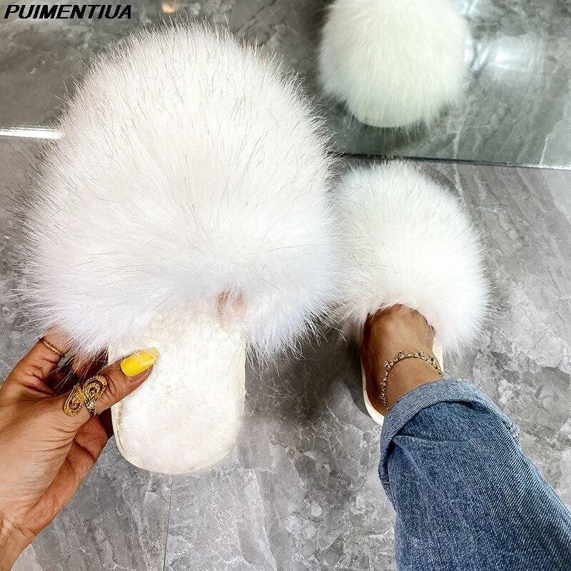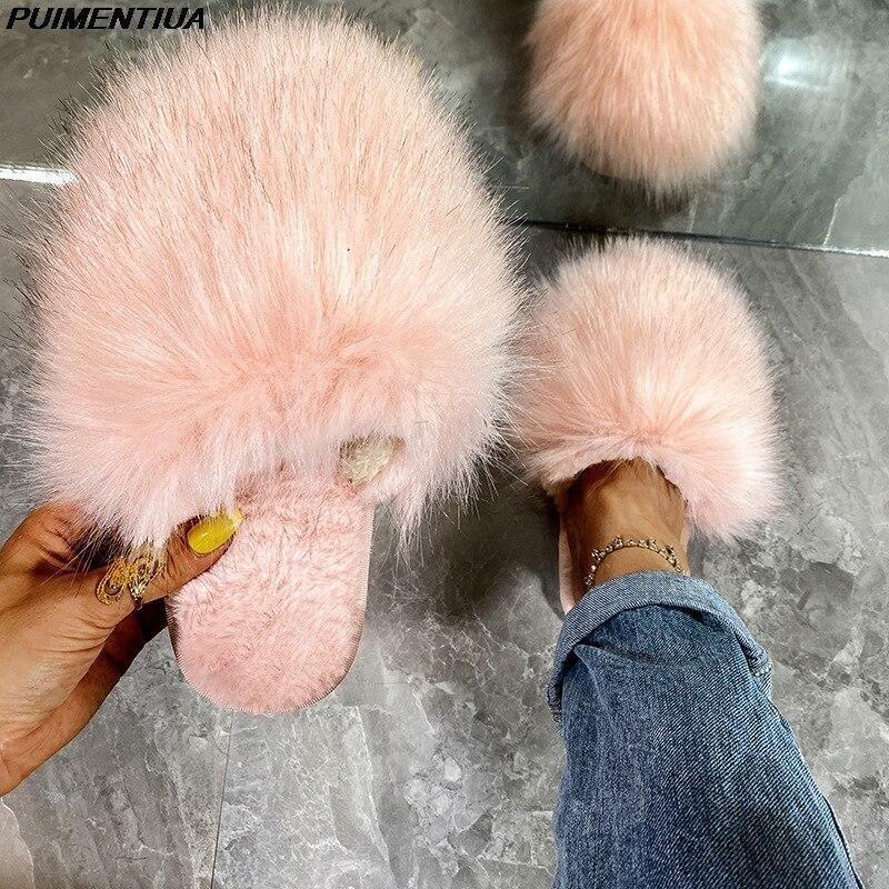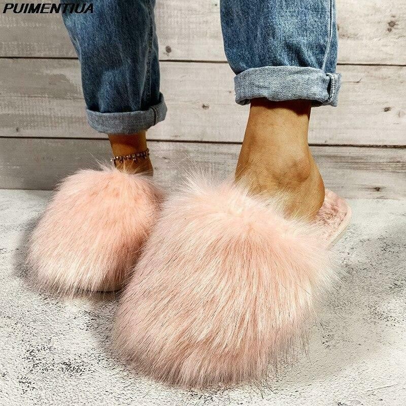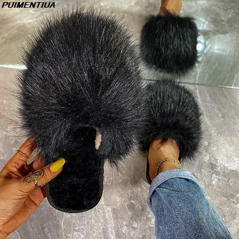Fur Slides Women Summer Furry Slippers Fluffy Home Shoes Ladies Luxury Fur Flops