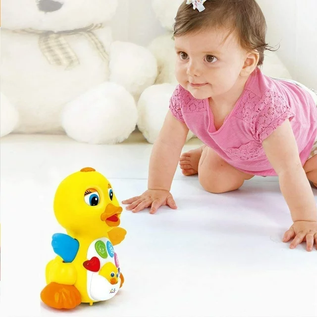 Make playtime and learning fun with HANMUN Walking Musical Dancing Yellow Duck. The little ducky will scoot around the home non-stop, providing endless entertainment for your young one. Features: Bump and Go Action, Wings flap and light up when the music begins, Lights, Music, and Talks (Adjustable Volume), Buttons on duck imitate duck sound and sing a tune Anytime the duck bags into something it just backs up and goes another way instead of just being stuck. It works a little smoother and quicker on the floor but works fine on the carpet.