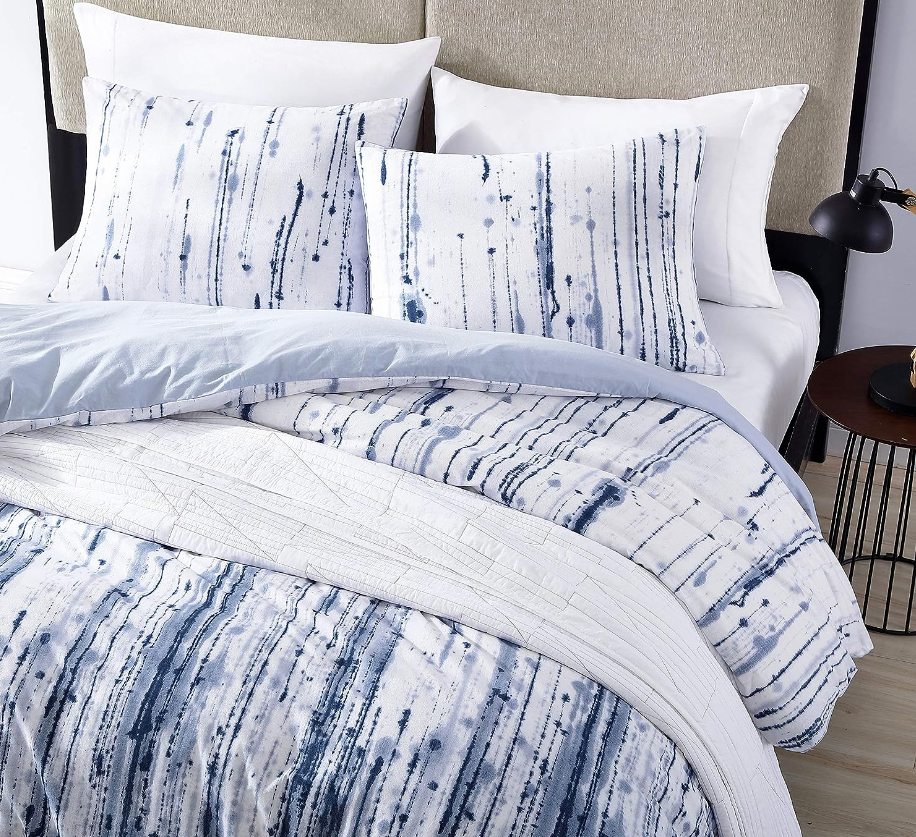 Update your bedding ensemble with the City Scene Sokal Comforter Set. Constructed with soft, prewashed cotton and featuring a bold, ink-dripped print in indigo, the Sokal Set is sure to give you the look of an artist’s studiowithout the mess. Comforter features a polyester fill and a solid light blue reverse. Set is machine washable for easy and convenient care.