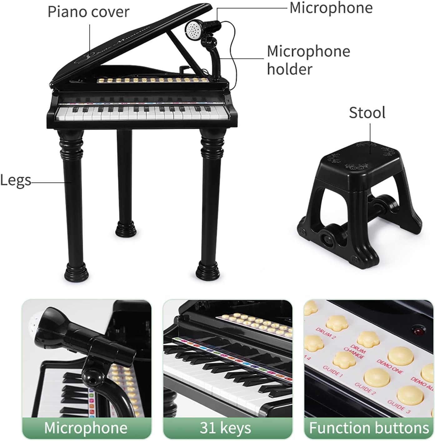 • [More Functionality, More Fun]—Kids piano is equipped with 31Keys, 8 percussion instruments, 3 teaching modes, 4 musical instruments,4 accompaniment styles, 22 demo songs, lights, Record & playback function and adjustable volume and rhythm. More functions will bring more fun to your child.