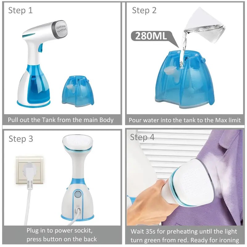 0V Frequency: 50Hz / 60Hz Rated Power: 1500w Steam Temperature: About 140-180 ℃ Water Tank Capacity 280ml, PTC Heating Device, Stainless Steel + ABS, Press Operation, 8 Minutes Idle Automatic Shutdown.